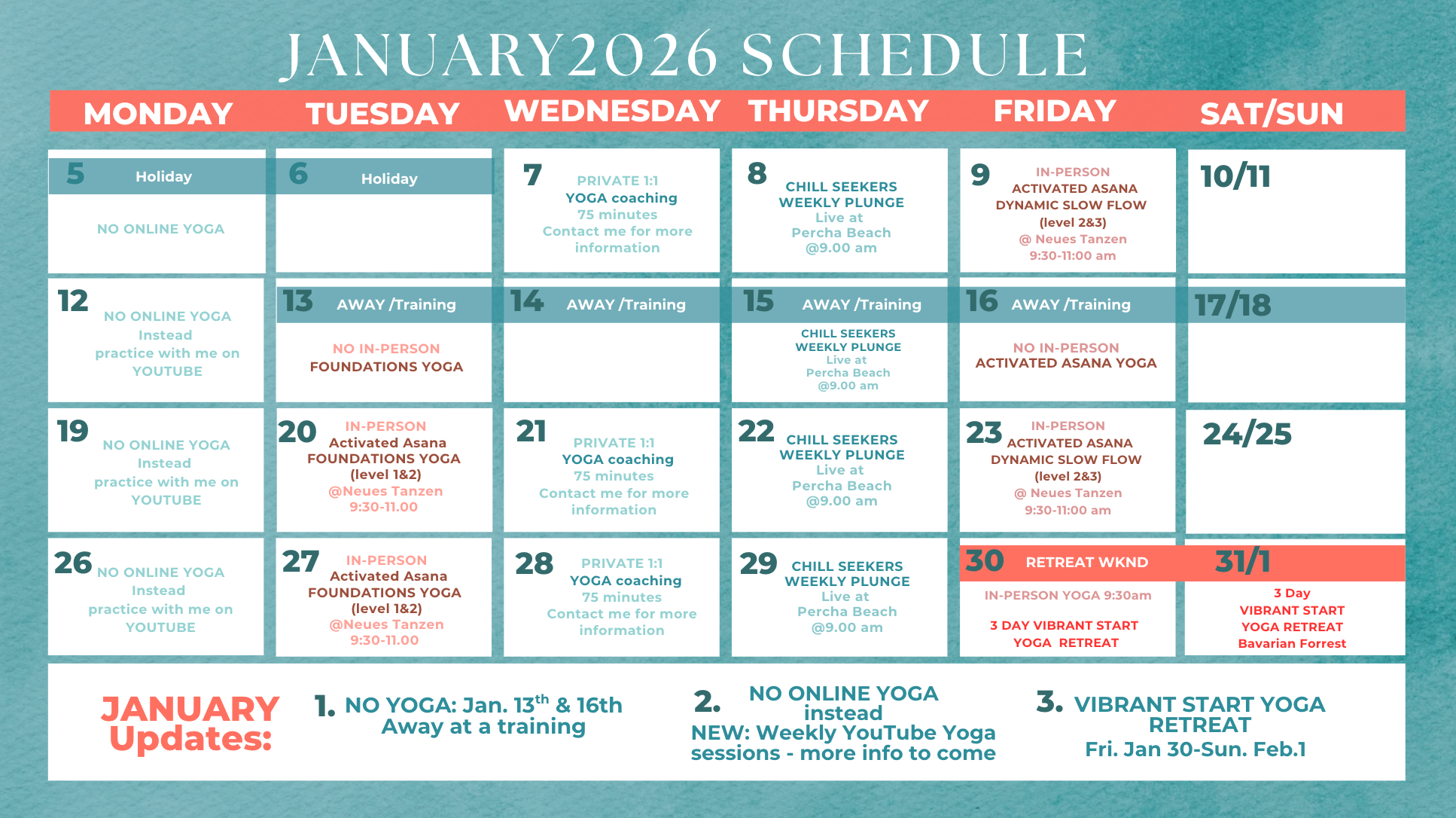 This allows you to attend any yoga class (Tuesday or Friday)Â when you can.